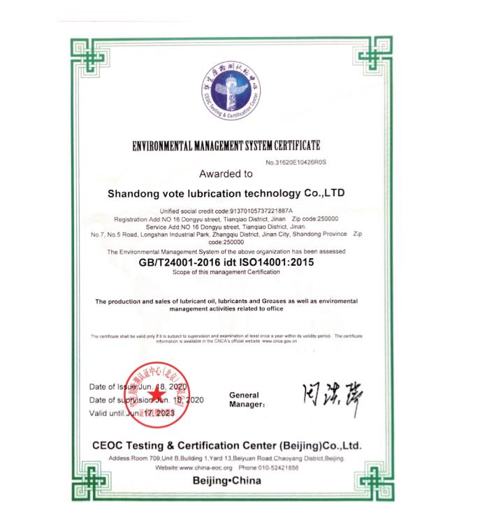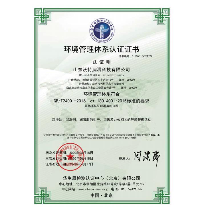 環(huán)境管理體系認證證書